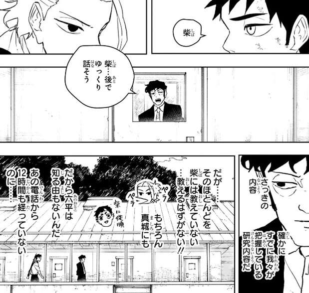 そして、柴と国重は蓮見によって別室に閉じ込められます。国重は柴に話しかけますが、柴は失敗したと思っているのか、真剣な顔をしたまま何も国重に答えません。一方、蓮見は柴に後でゆっくり話そうといった後、真城と研究室に戻りますが、歩いている廊下でさっき国重が話していた研究発表の内容について考えていました。国重が話した研究発表は既に妖術局や学者が把握している研究内容と同じようですが、そのほとんどは柴にも真城にも教えていないようで、柴が蓮見に電話してから12時間も経っていない短時間であれだけの内容を眼で見ただけで国重は導き出したのか、と内心驚いていましたが、ただまだ蓮見は半信半疑のようです。