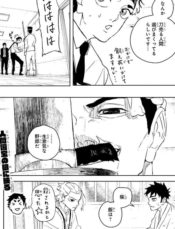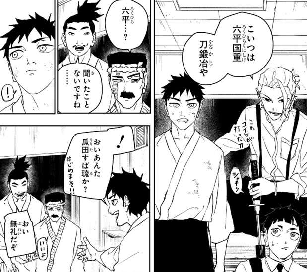 国重はこれまで通算200本ちょい打ってきたようですが、協会が定めた修了期間と月2本の原則があるようで、それを破っていないとありえないと瓜田の弟子に言われます。しかし国重は、いい刀作りさえすりゃ良いだろ、と悪気もなく平然と反論しますが、瓜田の弟子から、それだけの本数を打って無名なのは、大した刀を作っていないことの証明なんじゃないか?と言われると、……ぐうの音も出んな、と国重は言い反論しませんでした。しかし柴からそんなことより飯と言われると、国重は飯の事を思い出し目の色を変えて、自分なりの雫天石の研究発表をします。