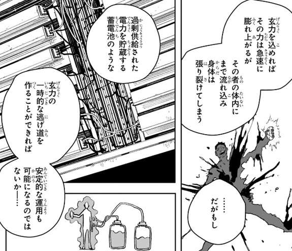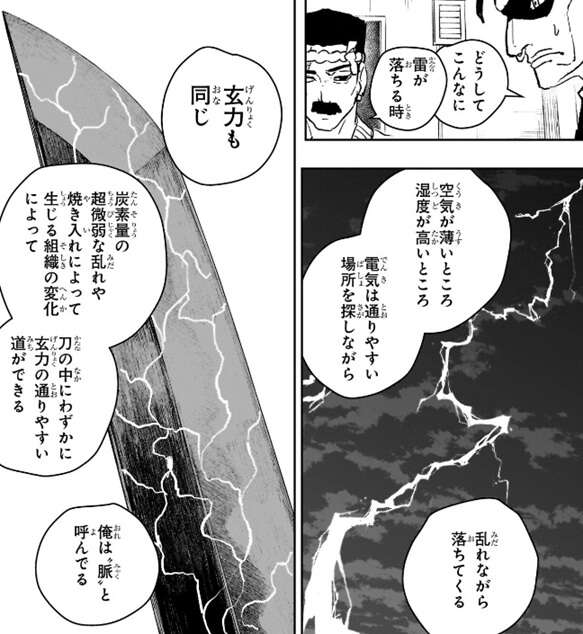 雷が落ちる時に空気が薄いところ、湿度が高いところのように電気は通りやすい場所を探しながら、雷が乱れながら落ちてくるように、玄力も炭素量の超微弱な乱れや焼き入れによって生じる組織の変化によって、刀の中にわずかに玄力の通りやすい道ができ、それを瓜田は“脈”と呼んでいるそうです。本来自然発生するその脈を、刀に込めた玄力が無駄なくただ斬るために廻るように瓜田は自ら設計していて、だから俺の刀には濁りのない殺傷能力がある、と瓜田は自分と他の刀との違いを説明します。
