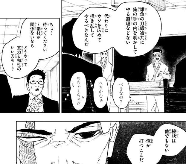 学者の調べではどの素材でも玄力との親和性を裏付ける科学的な証拠は見受けられず、学者は瓜田に玄力の通りやすい素材に関して、刀匠ならではの解釈があるのだと思い、それを詳しく伺いたいと言いますが、瓜田はあれはデタラメだ、といきなりぶっちゃけた本音を学者に話します。玄力の通りやすい素材など存在しないと瓜田は言い、著書に書いた内容もほとんどウソでテキトーに書いたそうです。瓜田は、雑魚の刀鍛冶共に自分の手の内を明かしてやる通りなどなく、代わりにウソを広めて搔き乱してやるべきなんだ、と自分の主張を話しますが、瓜田のめちゃくちゃな主張にその場にいる学者全員があきれます。瓜田は玄力と相性のいい刀を打つ秘訣は、自分が打つことだと断言し、いきなり丈治の顔面に鉛筆を投げます。
