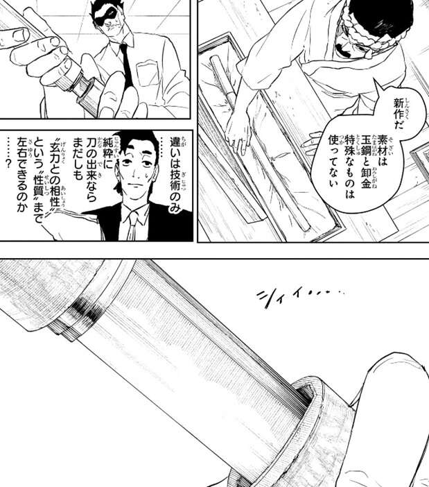 丈治は何とか自分の刀で鉛筆を真っ二つに斬り、顔に鉛筆が刺さるのを防ぎますが、何を、と丈治をつぶやき驚きます。瓜田は、いい剣士だ来い、と丈治に言い丈治の刀も褒めます。丈治の刀は加座船の最上作だそうですが、瓜田は自分の刀を持ってみろと丈治に言います。瓜田が持ってきた刀は新作で、素材は玉鋼と卸金で、特殊なものは使っていないそうです。一方、瓜田の話を聞いていた学者は、純粋に刀の出来ならまだしも、“玄力との相性”という“性質”まで技術で左右できるという瓜田の話に、どうだか…、とあまり信じていませんでした。