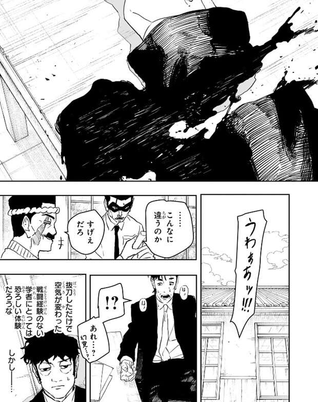 しかし、丈治が瓜田の刀を抜くと空気が変わり、戦闘経験のない学者はそれだけで自分の腕を斬られたと錯覚します。丈治も瓜田の刀の出来に驚いたようで、…こんなに違うのか、と思わず声が出ます。ほとんど瓜田の話を信じていなかった学者にすら幻覚を見せる瓜田の刀の出来に、抜刀しただけで空気が変わった、戦闘経験のない学者にとっては恐ろしい体験だろうな、と蓮見も驚きます。