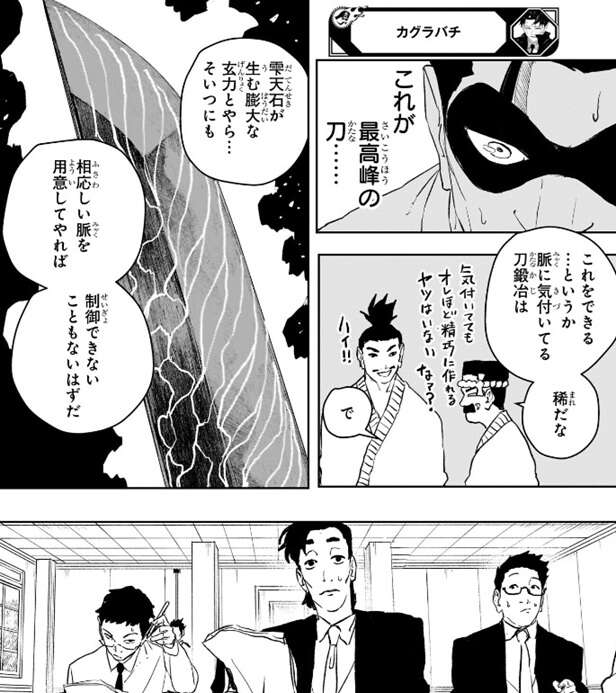 瓜田の説明を聞き、これが最高峰の刀……、と丈治は驚きますが、瓜田は脈に気付いている刀鍛冶は稀だなと言い、さらに気付いててもオレほど精巧に作れる奴はいない、なァ?と瓜田は弟子に同意を求め、瓜田の弟子も同意します。そして、瓜田は雫天石が生む膨大な玄力にも、相応しい脈を用意してやれば制御出来ない事もないはずだと言いますが、瓜田の話を聞き学者達は困惑します。それができるなら、“妖刀”ってやつが生まれるかもな、と言った所で、瓜田は突然自分の刀を抜刀します。