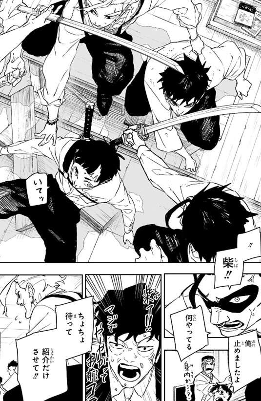 次の瞬間、柴が国重と真城を連れて瞬間移動で現れます。瓜田は柴の玄力や気配を察知して抜刀したようですが、蓮見と丈治は突然現れて、瓜田の説明の邪魔をした柴に激怒します。真城は柴を止めましたと言い訳し、柴は国重を紹介だけさせてと蓮見達に頼み込みます。