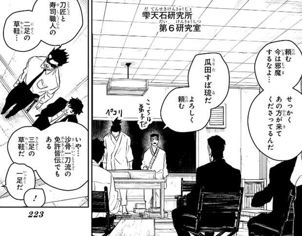 蓮見が丈治と呼ぶ妖術局職員に声を掛けて、柴が余計なことをしようとしている事を伝えます。すると丈治は、あのクソ餓鬼、…任務をなんだと思ってる…、と怒りますが、学者からの瓜田すば琉への質問の場が、今から雫天石研究所の第6研究室で行われるようで、頼む今は邪魔はするなよ…、とつぶやきます。瓜田すば琉は刀匠、寿司職人だけでなく、沙骨(さこつ)一刀流の免許皆伝の剣士でもあるようで、三足の草鞋だと蓮見は言いますが、瓜田に聞こえたのか、一足だ、と瓜田は訂正します。