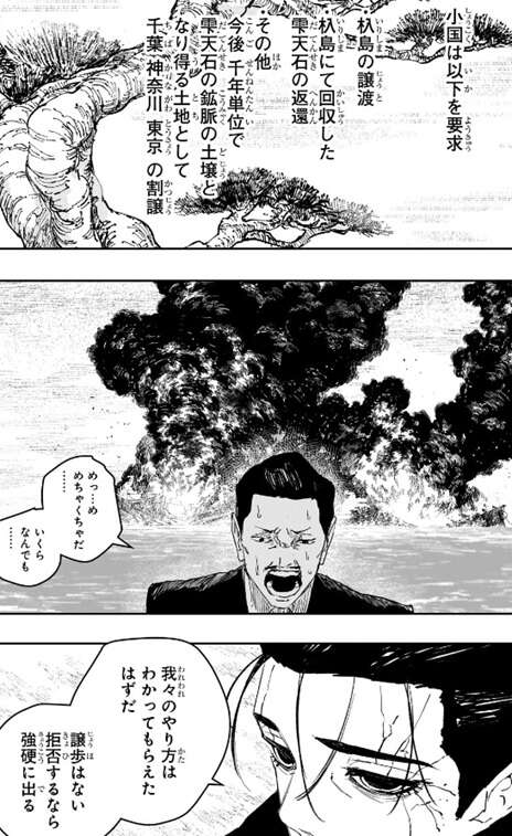 そして、男は日本の代表に要求が書かれた書簡を机の上に出し見せます。書簡には、杁島の譲渡、杁島にて回収した雫天石の返還、その他に今後千年単位で雫天石の鉱脈の土壌となり得る土地として千葉、神奈川、東京の割譲を小国は要求すると書かれていました。小国の滅茶苦茶な要求に、いくらなんでも……、とあまり言葉が出ない日本の代表ですが、男は、我々のやり方は分かってもらえたはずだ、譲歩はない、拒否するなら強行に出る、と答えます。