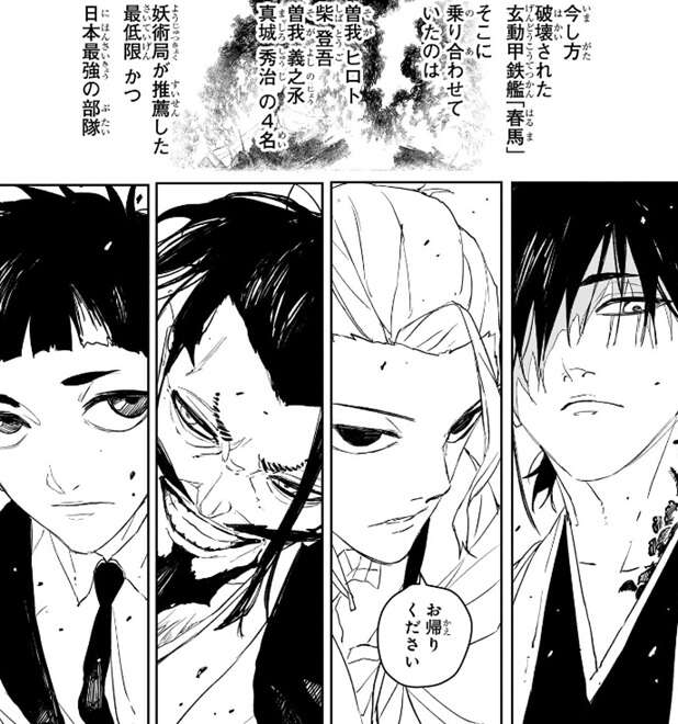 破壊された玄動甲鉄艦「春馬」には曽我ヒロト、柴登吾、曽我義之氶、真城秀治の4名が乗り合わせていましたが、彼らは妖術局が推薦した最低限かつ、日本最強の部隊でした。柴は男が出した書簡を突き返すと、お帰りください、と言います。