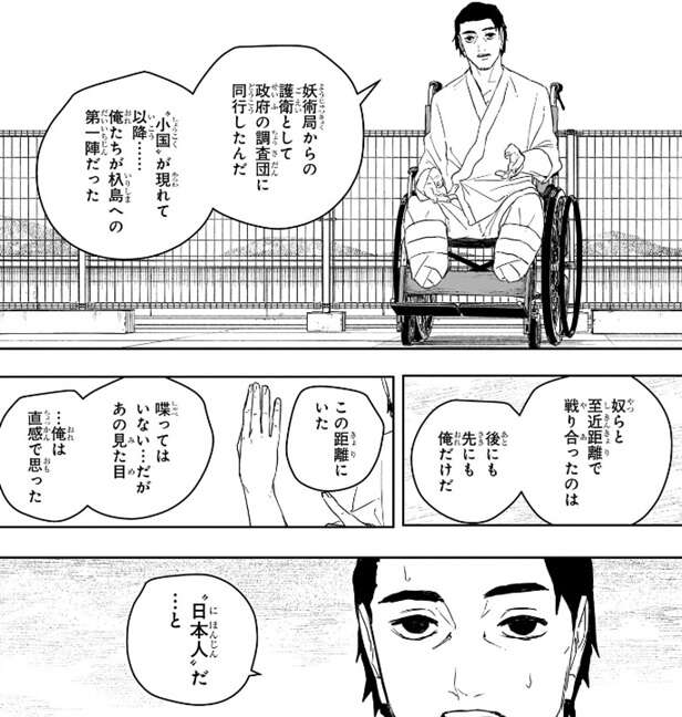 小国が現れてからの2年間、少国民との接触は杁島での小競り合いのみで、その間も彼らは中遠距離での牽制ばかりで彼らの正体は謎に包まれています。その少国民と接触した一人、杁島への第一陣となる政府の調査団に同行した妖術局の護衛で、至近距離で戦り合ったのは後にも先にも彼だけで、彼は喋ってはいないが至近距離から見た外見から少国民を“日本人”だと直感で思ったそうです。そして蓮見が相談している博士にも、南東の海域に突如現れた日本人(に似た人種)が潜む島、と聞いてピンとくるものがあったそうです。