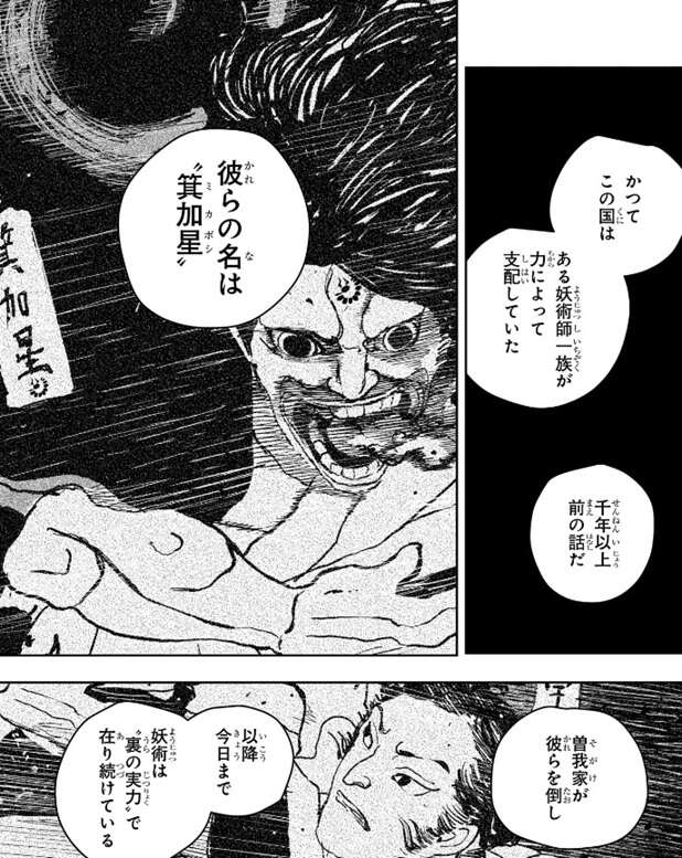 千年以上前、この国にはある妖術師一族が力によって支配していたそうです。彼らの名は“箕加星(ミカボシ)”といって、曽我家が箕加星の一族を倒して、以降妖術は“裏の実力”で在り続けています。箕加星は最後、現在の千葉に追い詰められて滅亡したと言われているそうです。そして、曽我ノ物語と書かれた古い書物らしきものには、箕加星に斬りかかる曽我宇几真という人物が描かれていました。