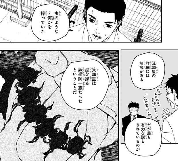 さらに至近距離で少国民と戦り合った妖術局の護衛は、少国民との戦闘で足を失っていますが、これは少国民の妖術によってやられたそうです。その妖術は虫のような何かを操るものだったそうで、先ほどの博士も箕加星には諸説あるが最も有力な説として、箕加星は蟲を操る妖術師一族だったそうです。蓮見は、…仮に小国の民が箕加星の子孫だとして…はるか昔に地を追われた…人間が海に潜み…千年以上誰にも気づかれることなく独自に文明を作り上げるなんて…、と博士の仮説に否定的ですが、不可能だよ、人知を超えたイレギュラーでも働かない限りな、と博士は言い、人知を超えたイレギュラーである雫天石を既に我々は目の当たりにしていると蓮見に説明します。