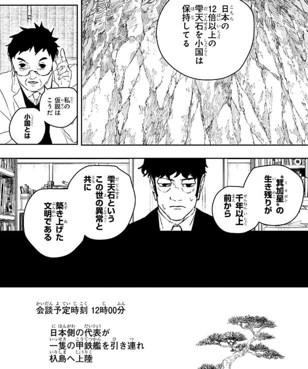 蓮見は杁島の鉱脈には雫天石が最低でも千キロは推定で存在し、日本の12倍以上の雫天石を小国は保持していると推測します。博士は自分の小国に関する仮説はこうだと前置きし、“箕加星”の生き残りが千年以上前から、雫天石というこの世のイレギュラーと共に築き上げた文明である、と蓮見に仮説を説明します。そして場面は会談予定時刻の三月二十日 12時00分へと移り、日本側の代表三名が一隻の甲鉄艦を引き連れて小舟で杁島に上陸します。まだ杁島には小国王家はいませんが、ご丁寧に椅子と机が並べられていました。