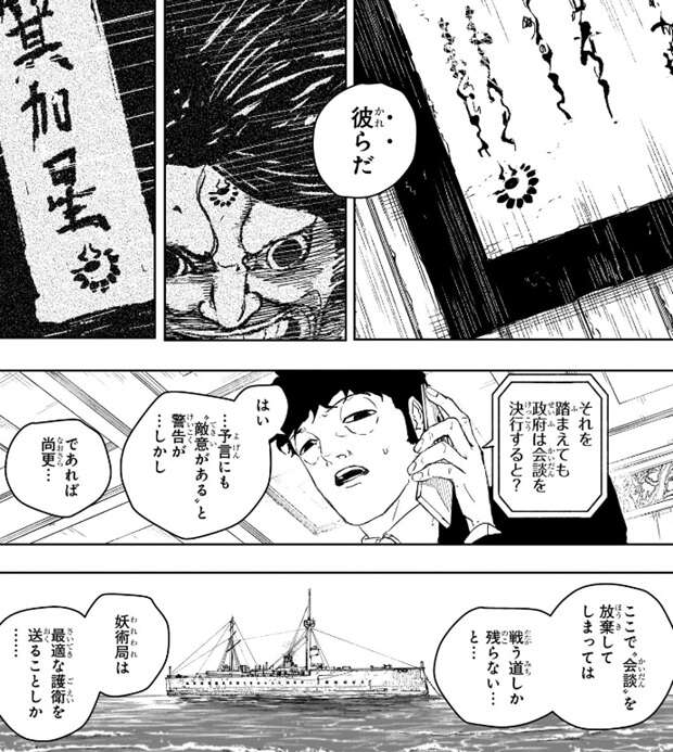 一方、同じ頃に蓮見は先ほどの学者に電話をしていました。前回、小国の者三名が残した書簡には、古い書物に書かれていた箕加星のマークと同じマークが記されていて、蓮見は小国民が箕加星の一族だと断定します。政府はそれを踏まえて、さらに予言では“敵意がある”と警告があっても、会談を決行したそうです。政府としては、尚更ここで“会談”を放棄してしまっては戦う道しか残らないと考えたそうで、妖術局は最適な護衛を日本の代表につけたそうです。
