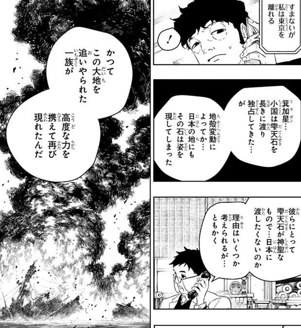 第117話では、小国の民とは千年以上前に曽我家に倒された箕加星という妖術師一族で、箕加星の生き残りが千年以上前から雫天石と共に築き上げた文明が小国という事が判明します。