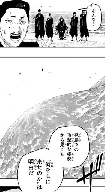 突然の味方の甲鉄艦の爆発に驚く日本の代表三名が海を見ると、いきなり海がせり上がってきます。そして、いつの間にか杁島には小国王家と思われる五名が姿を現していました。