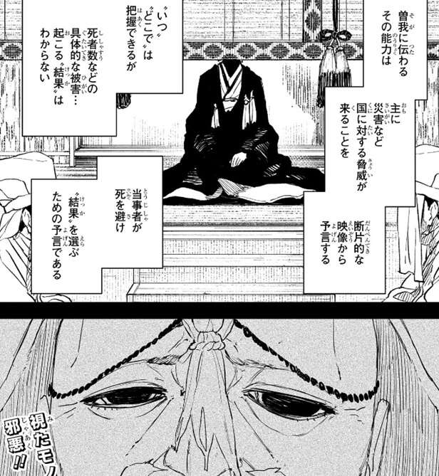 曽我に伝わる予言の能力は、主に災害など国に対する脅威が来ることを断片的な映像から予言するそうです。しかし“いつ”“どこで”は把握できるが、死者数などの具体的な被害、起こる“結果”はわからないそうで、当事者が死(さいあく)を避け“結果”を選ぶための予言となるようです。来る“会談”は敵意に満ちている、と千晃は予言したようですが、そこに老人の顔が浮かび上がっています。