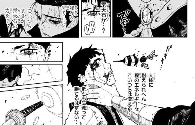 咼楽による攻撃で太もも貫かれた真城は首を戦闘員に掴まれてしまい、身動きが取れなくなります。戦闘員の胸の辺りにある石を見て、小国の民が雫天石の力を使っていると真城は直感し、人体に耐えられないほどのエネルギーをこいつらは使える…、まともに戦って勝てるはずもない…、と心の中でつぶやきます。