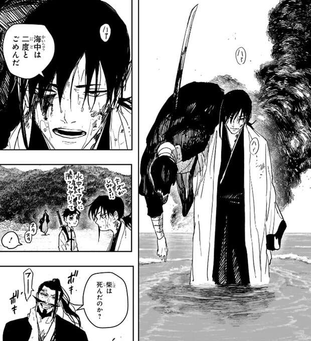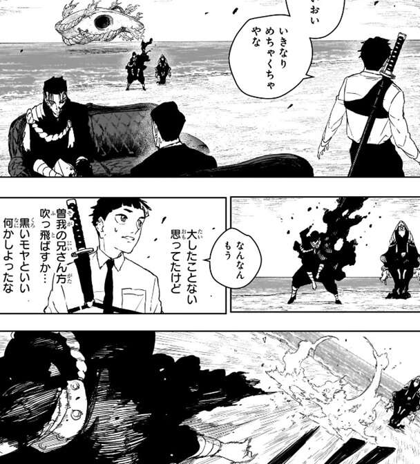 若い曽我家の男は戦闘員三人の攻撃が届くよりも前に、男の喉を刀で斬りますが、戦闘員三人によって曽我家の二人は吹っ飛ばされます。柴は瞬間移動の妖術で戦闘員一人と一緒に、海上に移動します
