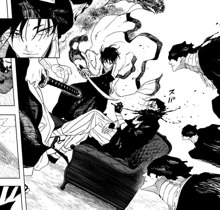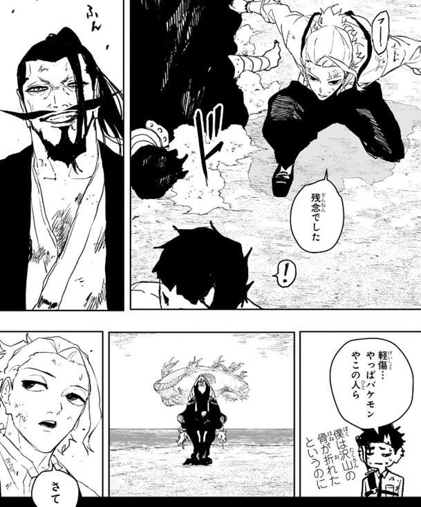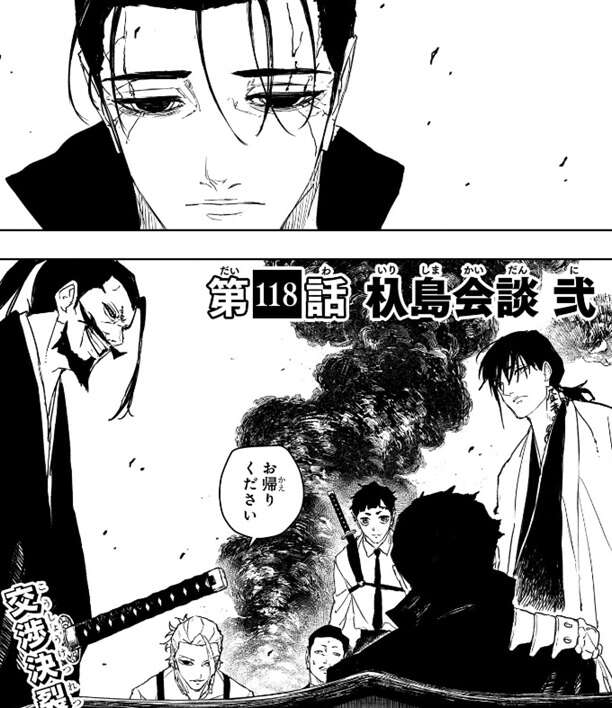 第118話では、杁島会談で戦闘が始まり、小国の男は曽我家の男に首を刀で斬られて死んだように見え、さらに他の戦闘員四名もそれぞれ柴達にやられて、残りは爺さんただ一人になったと思われました。しかし、ラストでは小国の男の様子に変化が出てきて、宙に浮いたような状態になり、男はまだ死んでいないようです。