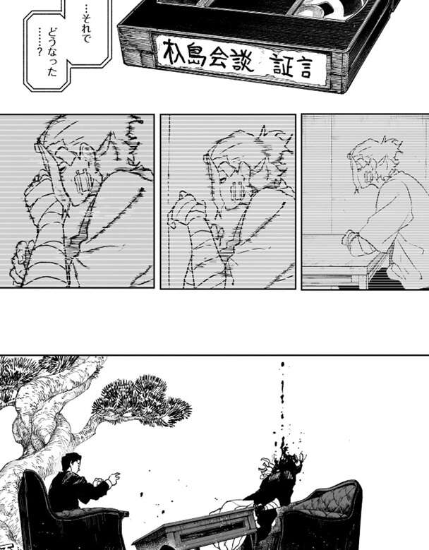 『杁島会談 証言』と書かれたテープが貼られたビデオテープの映像には、おそらく杁島会談の戦闘後に記録した映像が記録されているようです。その映像が再生され、怪我をした柴に、…それでどうなった……?と、誰かが質問しています。一方、椅子に座ったまま首を斬られた小国の男ですが、死んではいないようで、様子に変化が出てきて男が宙に浮いたような状態になります。