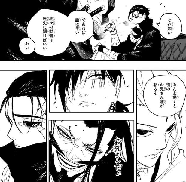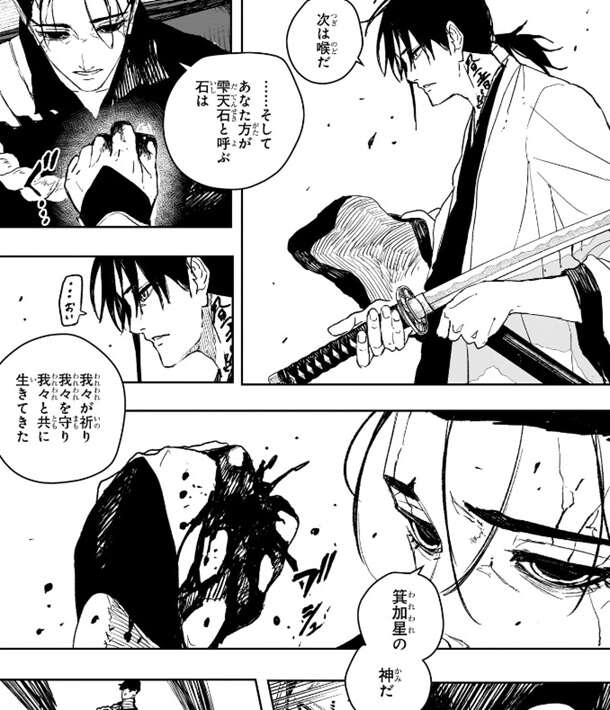仕事を済ませたら帰る、と男は言いますが、真城は奥の爺さんと一緒にいる戦闘員4人より、この目の前の男の方がヤバイと感じていて、好きに動かしたらあかん…、と男を警戒します。柴が、“箕加星”という単語を言うと、ご存じか、であれば話は早い、我々の動機は歴史に聞けばいい、と男は言い、自分達が箕加星の一族であるという事を認めます。しかし男が勝手に動いたので、あんま動くと横のお兄さん達が斬るぞ、と柴は男に警告します。