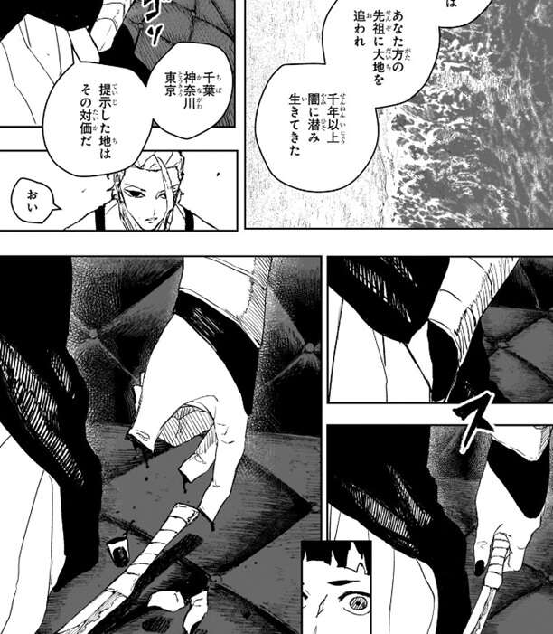 男は柴の警告を無視して話し続け、我々箕加星はあなた方の先祖に大地を追われ、千年以上闇に潜み生きてきた。千葉、神奈川、東京、提示した地はその対価だ、と自分達の主張を続け、ポケットからナイフを出そうとしますが、若い曽我家の男に指を斬り落とされます。