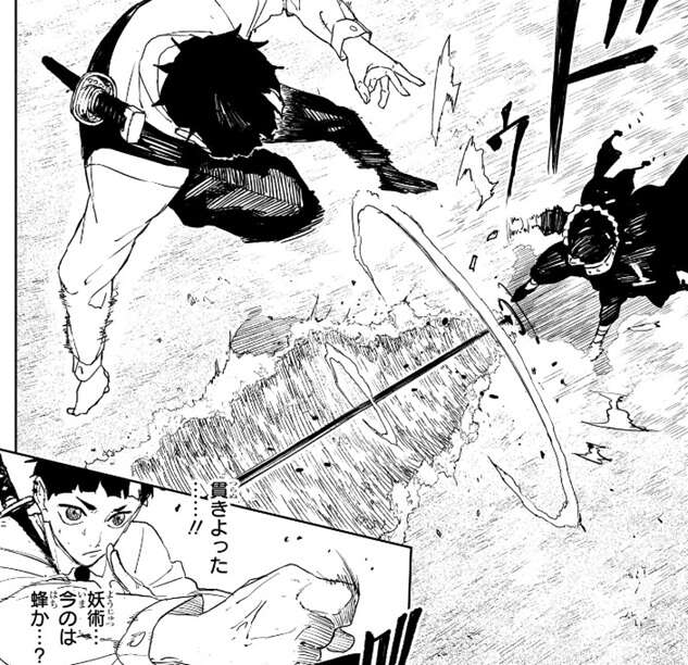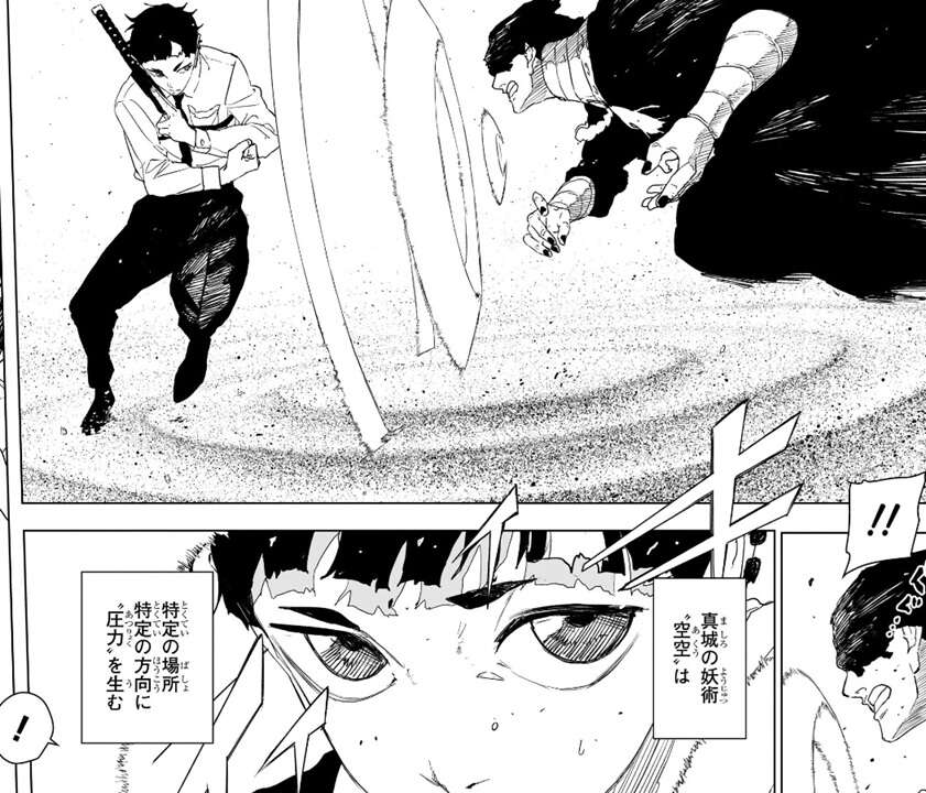 真城に襲い掛かった戦闘員に対して、真城は妖術“空空(あくう)”を使用します。“空空(あくう)”は特定の場所、特定の方向に圧力を生み、戦闘員は生まれた圧力によってそれ以上前に進めなくなりますが、戦闘員は技“咼楽(けら)”という妖術を使用して真城を攻撃します。