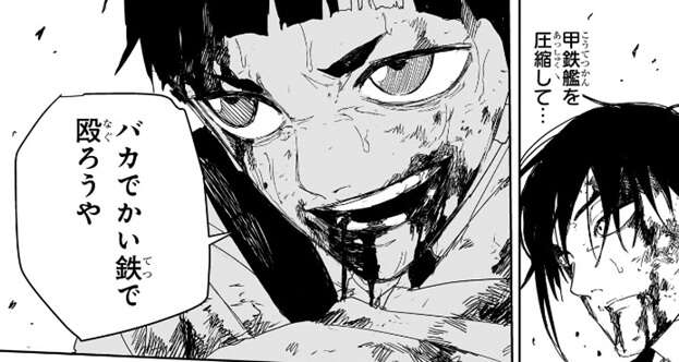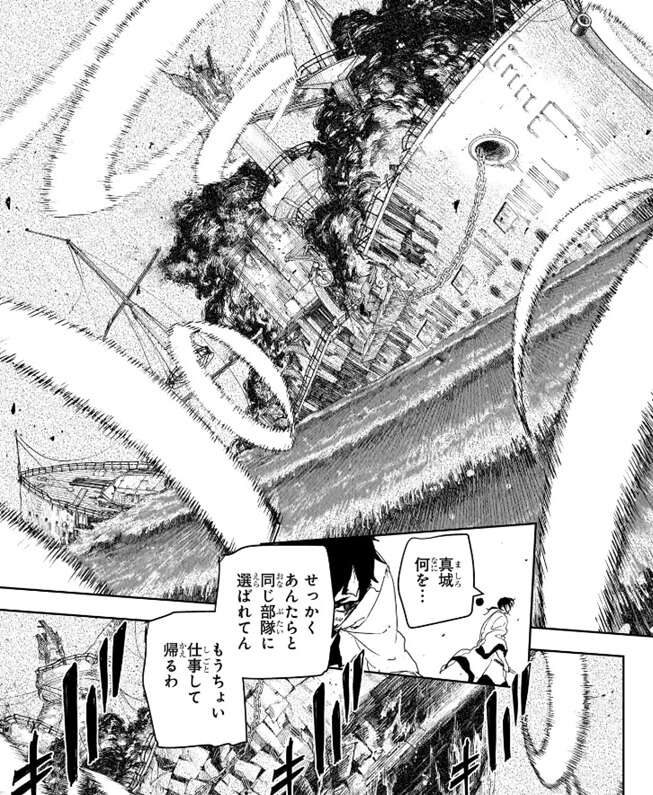 せっかくあんたらと同じ部隊に選ばれてん、もうちょい仕事して帰るわ、と真城は言うと、甲鉄艦を圧力でバカでかい鉄の塊に圧縮します。