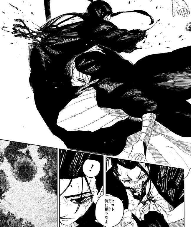 ヒロトは義之氶に重力を乗せて、鉄の塊を二人に向けて落します。亜利雨は義之氶もろとも道連れにするつもりかと考えますが、柴が瞬間移動で現れ、どうぞお一人で、と亜利雨に言うと義之氶だけを連れて瞬間移動で退避します。