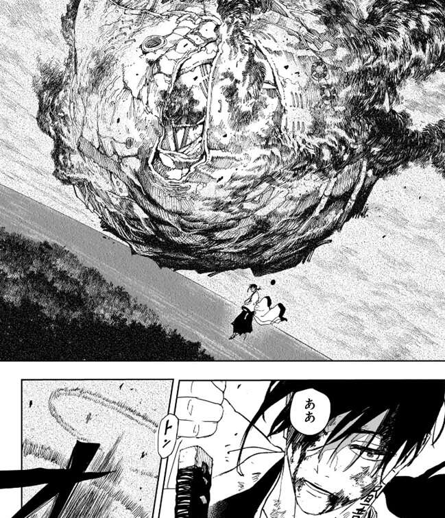全部出せよ、俺らが峠だぜぇ、と義之氶は亜利雨に言いますが、一方その頃、海岸ではヒロトが真城に亜利雨の能力について説明していました。人間離れした生命力、さらに受けた傷を再生、妖術を無効にする、という説明を真城は聞かされると、…ほな物理で木っ端微塵、と言い、妖術・空空で爆破された甲鉄艦を圧縮し始めます。