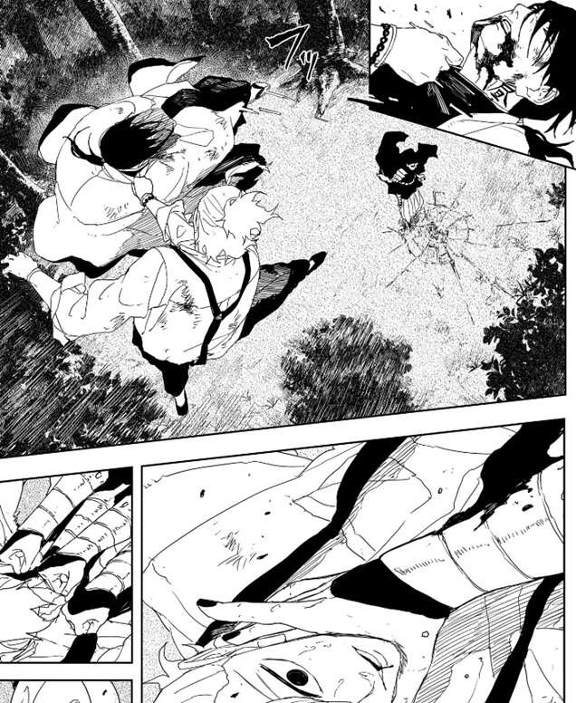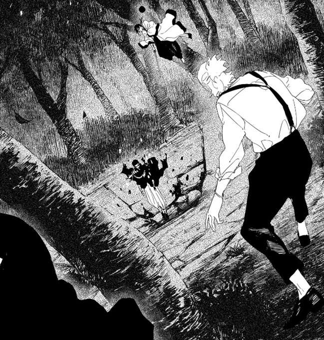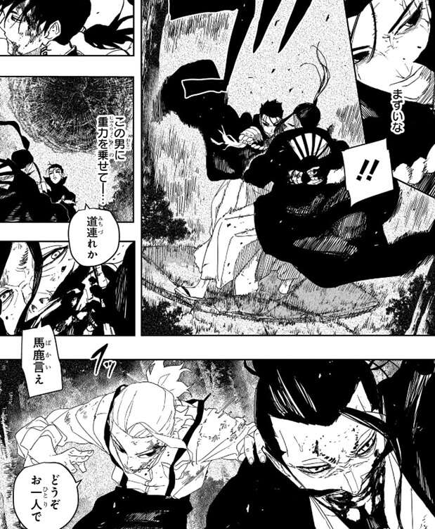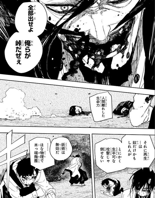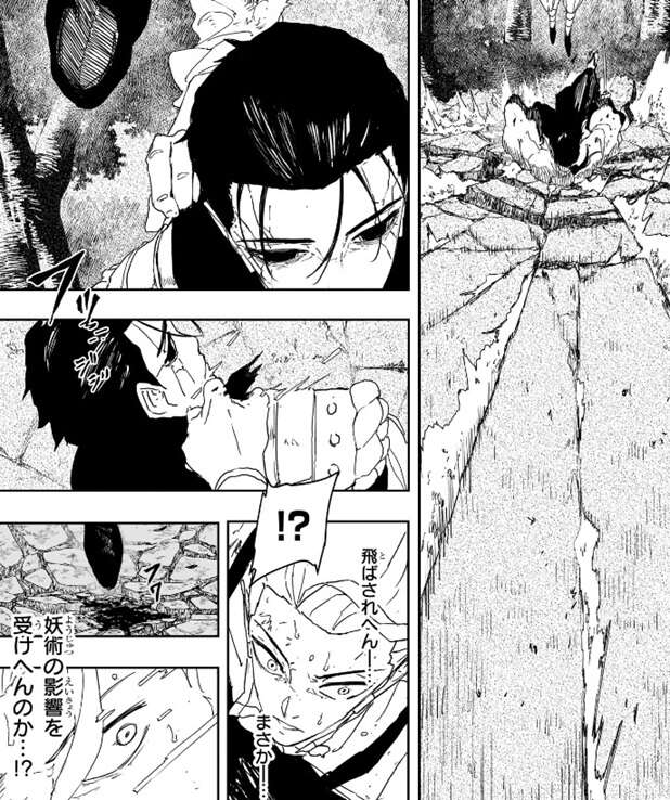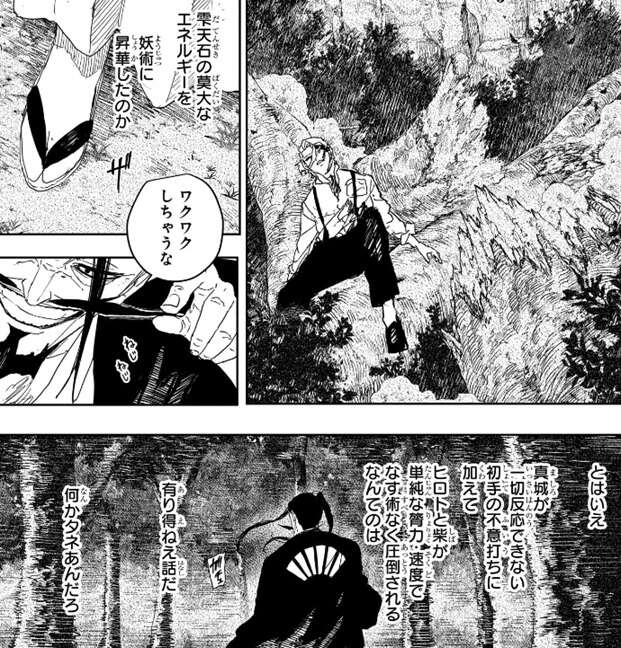 柴は森の奥まで吹っ飛ばされ、ヒロトは真城のいる海岸まで吹っ飛ばされます。曽我義之氶は亜利雨が雫天石の莫大なエネルギーを妖術に昇華した予測、髭をねじねじ触りながら、ワクワクしちゃうな、と嬉しそうにつぶやきます。しかし、真城が一切反応できない初手の不意打ちに加えて、ヒロトと柴が単純な膂力・速度でなす術なく圧倒されるのはあり得ないと義之氶は考え、亜利雨の妖術には何かネタがあると推測します。