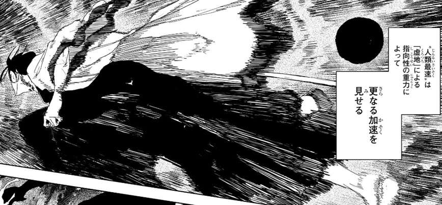 一方、ヒロトの肉体は人類の最高到達点で、“虚地”を操れるほど剣術・体術を極めているので最高の敏捷性、最高の筋力を持っています。その“人類最速”のヒロトは「虚地」による指向性の重力によって、更なる加速を見せます。