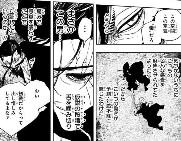 この義之氶の斬撃は亜利雨に防がれますが、義之氶は舌を噛み切って痛みで感覚を晴らして、亜利雨が作った空間・空気に毒がある事を証明していました。亜利雨の作り出した空間には毒の効果があり、気付かないうちに真城達は色々な感覚を麻痺されられていて、それで亜利雨の動きに予測・対応出来なかったようです。義之氶は亜利雨に、おい、初戦だからって出し惜しみしてるよなァ、と話しかけます。