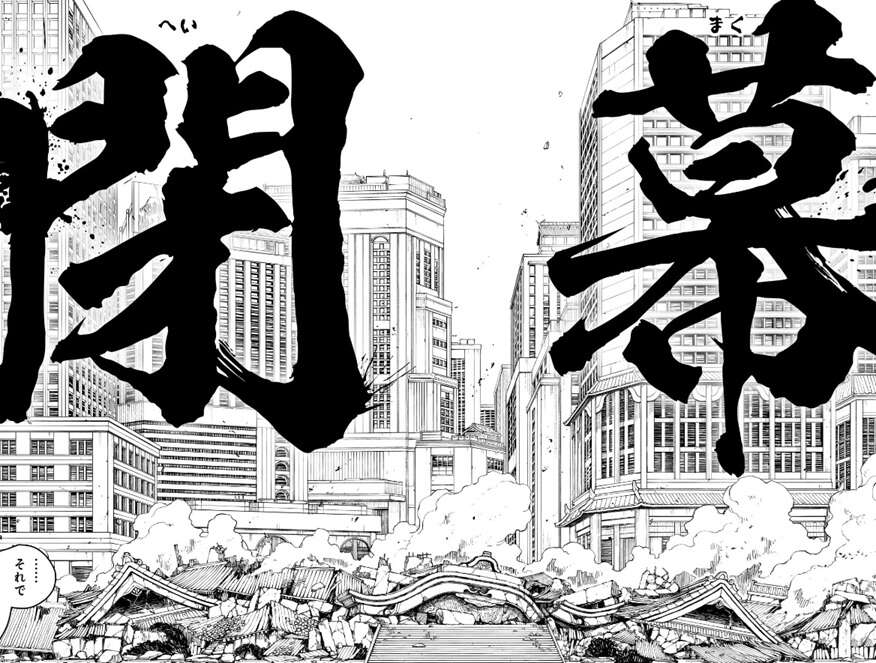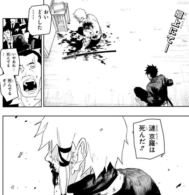 蔵から出てきたチヒロと京羅ですが、京羅は死んでいてさらに楽座市会場は崩れ始めます。真打の浸食や爆弾による損壊、さらに緋雪が暴れた事で会場も限界のようで神奈備 真打落札組の神奈備職員は、会場が壊れる前にとっとと避難します。