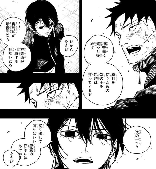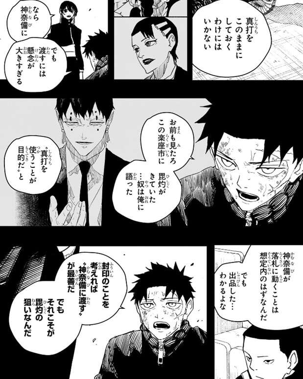 そして、真打をこのままにしておくわけにはいかないが、俺には封印の手立てがないとチヒロは言います、封印の手立てがないと言うチヒロに、なら神奈備に渡せと緋雪は言いかけますが、チヒロは渡すには懸念が大きすぎると答えます。この楽座市に来ていた毘灼は“真打を使うことが目的だ”と語っていた、さらに毘灼は神奈備が真打の落札に動くことは想定内のはずなのに出品した、封印のことを考えれば“神奈備に渡す”が最善だが、それこそが毘灼の狙いだとチヒロは緋雪に言います。