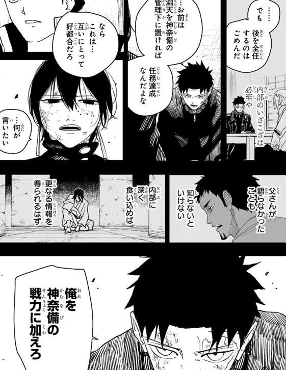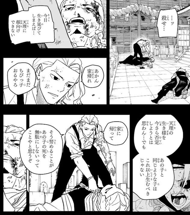場面は柴と漣円慈の戦いに決着がついた時に戻り、負けた円慈は柴に自分を殺すように言いますが、柴は円慈に家に帰るように言います。天理の生き様は否定しないがあの子と同じような子はこれ以上生むべきじゃないと柴は言い、まだ漣家には小さい子供がいるはずだから、家に帰ってそう務める事が天理の死を無駄にない事だ、と柴は円慈に言い、円慈も結局は柴の言う事に従ったようです。場面は現在に戻り、ハクリは漣家の敵として父さんを死なせてしまった、どの道家に帰ることはない、自分にとっては歪んでいても父さんが道標だったと言い、ハクリはこれからどう生きればいいか迷っていました。