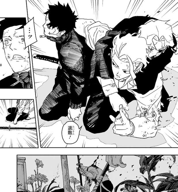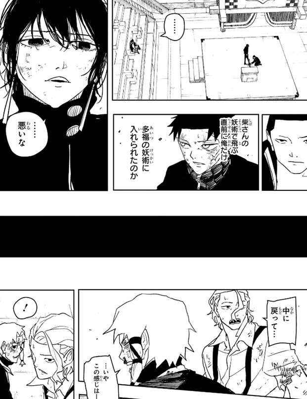 さらに会場全体が崩れそうになりますが、競りに来ていたヤクザ達は避難せずに妖刀をチヒロから奪おうとします。チヒロは戦闘で限界が来たようで気を失いかけますが、柴がチヒロとハクリを連れて瞬間移動の妖術で会場の外へ飛ぼうとします。