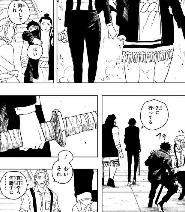 そして爆発した玄関部分から緋雪と田福、さらに多福に背負ってもらってチヒロも無事に会場の外に出てきます。チヒロが多福に降ろしてくれと言うと、多福は素直にチヒロを降ろします。緋雪は、先に行ってる、と言い楽座市会場を去ろうとしますが、緋雪が手に真打を持っているのに気付いた柴が緋雪を呼び止めます。