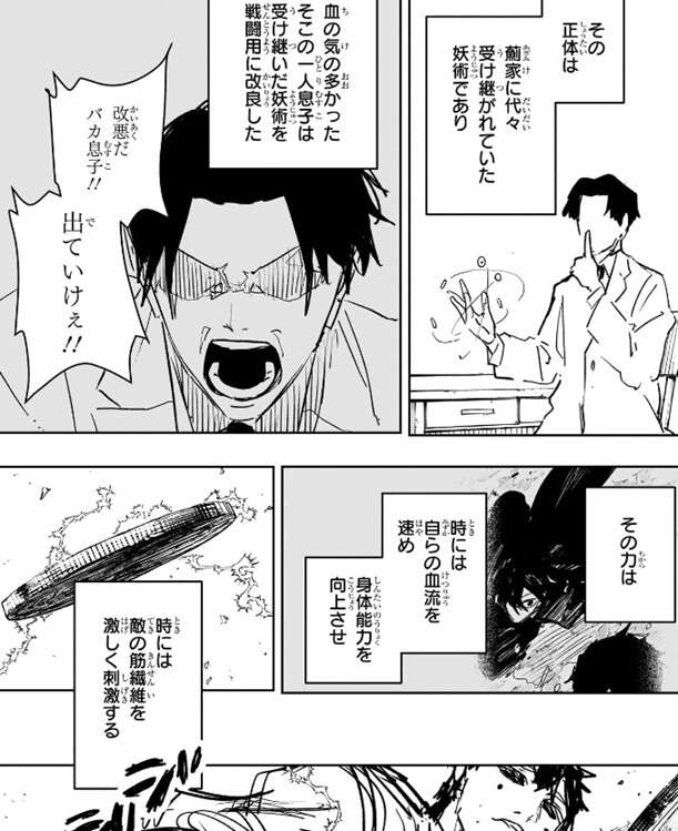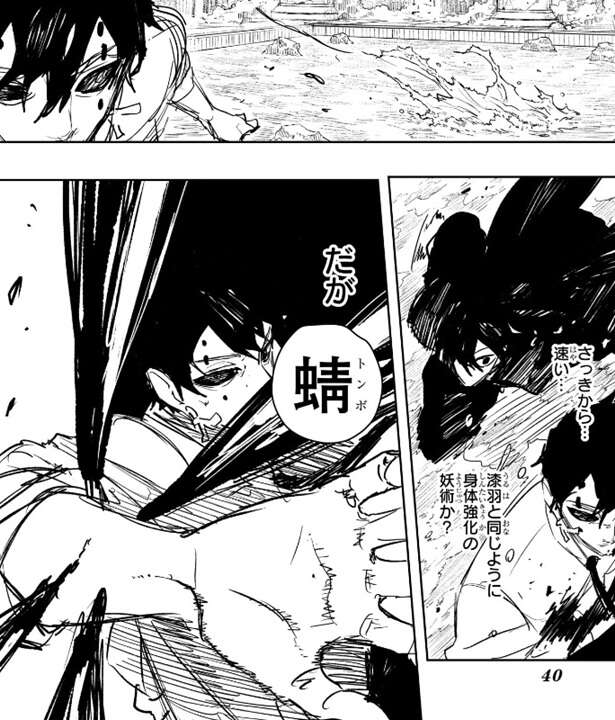 薊はチヒロ達が本部の上にいるはずなのにまだ来ない事を一瞬気にしますが、すぐに自分のやる事は変わらないと目の前の幽に集中します。薊の動きが速くなっているようで、幽は薊の妖術・己印は漆羽と同じように身体強化の妖術か?と推測します。そして、幽は蜻を使用して、浸食する玄力を直線上の薊に放ちます。