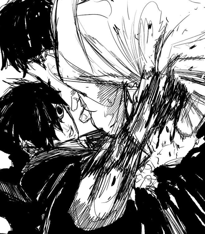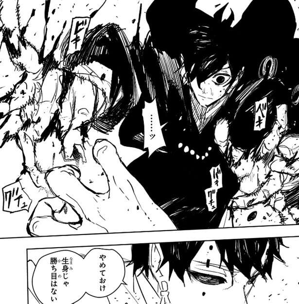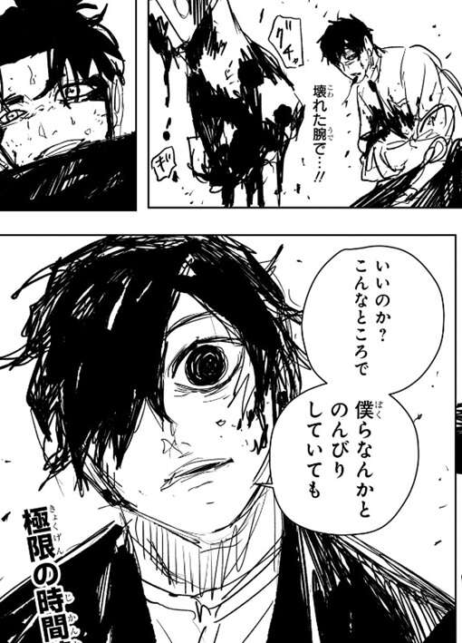 さすがに壊れた右腕では殴殺できませんでしたが、薊は、いいのか?こんなところで僕らなんかとのんびりしていても、と幽と言います。薊の目的は最初から幽を足止めし時間稼ぎをして剣聖の所に行かせず、さらに妖刀を持つチヒロと座村の到着を待つ事でした。
