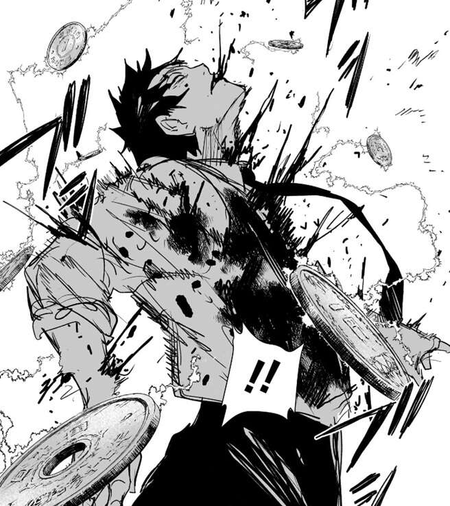 幽の周辺に現れた複数の硬貨に電流が流れ、筋繊維を激しく刺激し全身から血が噴き出るほどのダメージを幽に与えます。