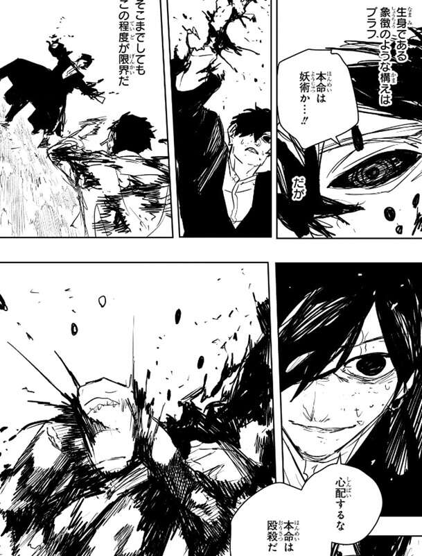 それでも薊達はチヒロ達が来るまで時間稼ぎをしようとし、薊は己印を使って幽に全身から血が噴き出すほどのダメージを与えます。しかし薊にとって妖術は本命でなく、本命は殴殺で壊れた腕でもお構いなしに幽を殴殺しようとします。