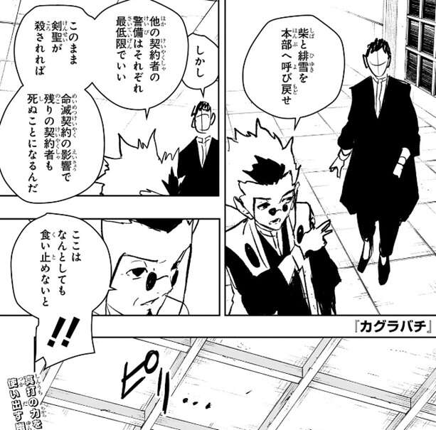壱鬼は他の契約者の警備に当てていた柴と緋雪を本部へ呼び戻すように、神奈備職員に指示します。このまま剣聖が殺されれば、命滅契約の影響で残りの契約者も死んでしまうので、他の契約者の警備は最低限にしてこの本部に戦力を集中させるつもりの様です。その時、壱鬼が上空である気配を感じます。