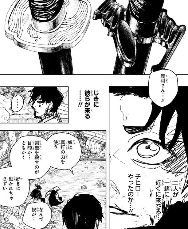 幽や薊、漆羽もある気配を感じたようですが、その気配は2本の妖刀、淵天と飛宗の気配でした。チヒロと座村が近くに来ていると知り、じきに彼らが来る……!!と、漆羽は確信します。一方、薊は漆羽とナツキに幽が真打の力を使うことを教え、剣聖を殺すのが目的か…、ともかく好きに動かれちゃまずい、と言い、漆羽とナツキに幽を僕らでここに留めておくぞと言います。漆羽は幽が放った先ほどの衝撃波が真打の力だと知り、チヒロ達の言っていた“ムカデ”がこの事だったのだと理解しますが、ヒビが入った柱を見て何かを察知したようで、漆羽は薊とナツキにもその何かを知らせます。