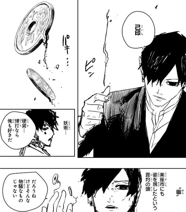 浸食する玄力をくらった薊は両手が、バキグチャ、と嫌な音を立てながら壊れていきます。幽は生身では真打の力に勝ち目はないと言いますが、その時己印で作られた硬貨が幽の周辺に何枚も現れ、さらに硬貨に電流が流れます。