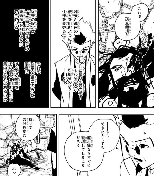 一方、一鬼は飛宗と淵天が本部の上に気配があるのに、なぜかすぐに降りてこず不思議に思いますが、神奈備職員から電波が繋がらず連絡が出来ないと聞き、結界に何かが仕込まれたのだと気付きます。嘉仙が、この混乱の中…同志がうまくやったようだな、これで孤立無援だ、と言うと、一鬼は淵天と飛宗の侵入を阻むように仕様を変更した可能性を考えます。従来の設定は“神奈備以外の妖術師”を阻むようにしているようですが、それを“淵天と飛宗のみ”に限定し、すべての容量をその侵入を阻むことに集中すれば可能かもしれないと一鬼は考えます。しかし一鬼は、もしできたとしても座村達ならすぐに破壊してしまえるだろう、持って数分程度だ、と嘉仙に言いますが、嘉仙は、……全てを懸けた数分だ……、と答えます。