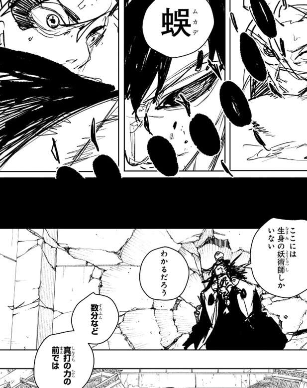 薊達と戦っている幽は再び蜈を使用、衝撃波が薊達を襲います。ここで場面は嘉仙に戻り、生身の妖術師では数分など、真打の力の前では殲滅するには十分な時間だ、と嘉仙はつぶやきます。