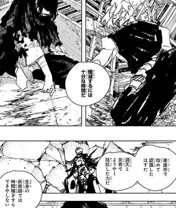 実際、幽の蜈をくらった漆羽とナツキは倒されてしまっています。嘉仙は、楽座市で改めて認識したはずだ、淵天と炎骨でようやく拮抗した力だ、生身の妖術師では時間稼ぎすらできやしない、とつぶやきます。
