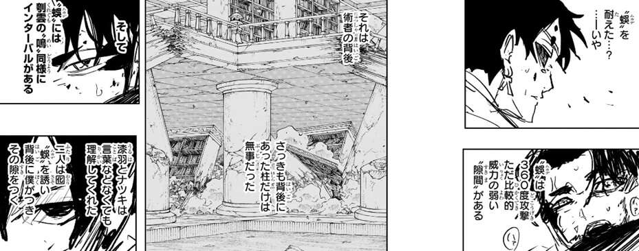 先ほど漆羽がヒビの入った柱を見て何かに気付いていましたが、それは“蜈”は360度攻撃ですが比較的威力の弱い“隙間”があり、それが術者の背後でした。先ほどの柱に関してもほとんどが破壊されていたのに、幽の背後の柱だけヒビだけで済んでいて、それを見て漆羽は蜈の隙間に気付き、薊に知らせていました。さらに“蜈”には刳雲の“鳴”同様にインターバルがあるようで、言葉にせずとも漆羽とナツキの二人は囮になってくれて“蜈”を誘い、幽の背後についた薊は無事でした。そして薊はインターバルの隙をついて幽を攻撃します。