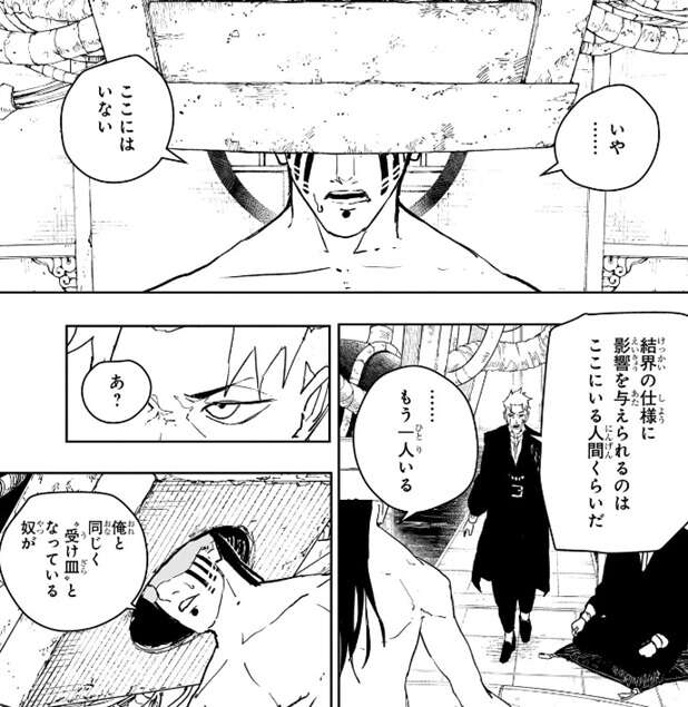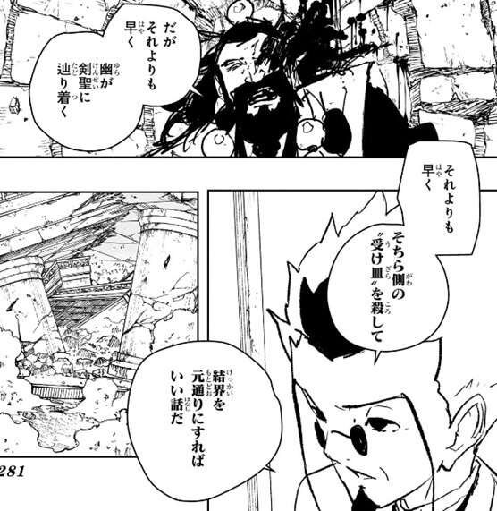 嘉仙は壱鬼に、不安定が故に数分のうちに結界は破られるだろう、だがそれよりも早く幽が剣聖に辿り着く、と言います。しかし、壱鬼はそれよりも早くそちら側の“受け皿”を殺し、結界を元通りにすればいいと言います。