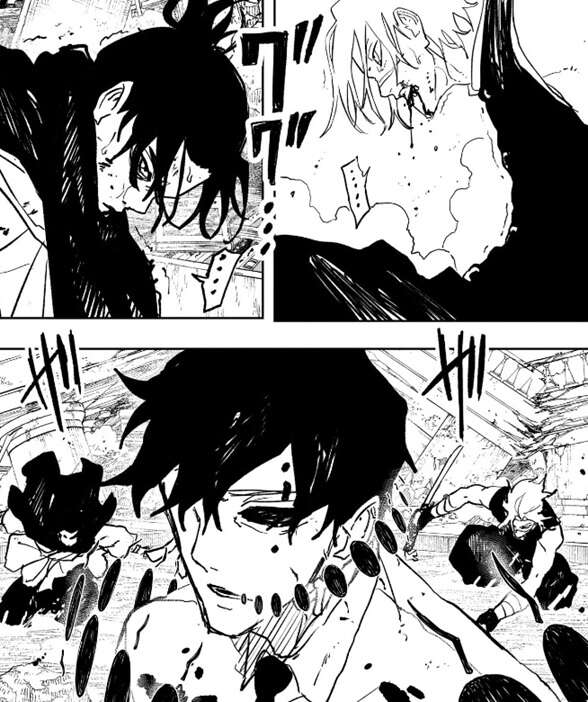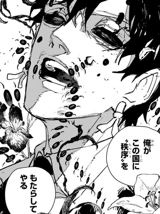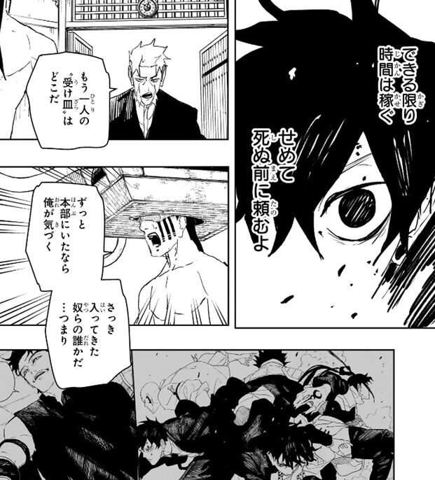 薊は、できる限り時間は稼ぐ、せめて死ぬ前に頼むよ、と心の中でつぶやき、“受け皿”を殺し結界を戻して増援が早く来るように本部に頼みます。一方、亥猿は結界の要である妖術師にもう一人の“受け皿”がどこにいるか聞き、結界の要である妖術師はさっき侵入した毘灼の誰かだと答えます。